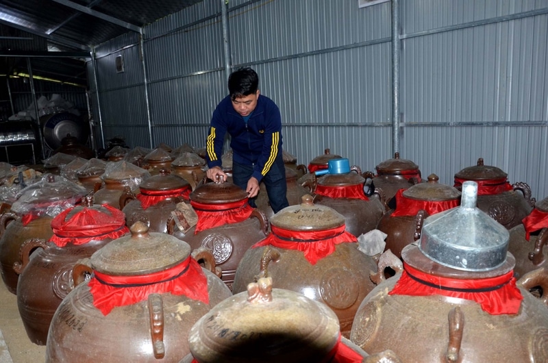 Đến thăm gia đình chị Hà Thị Tín ở thôn Nà Pài, hiện là Phó Giám đốc Hợp tác xã nấu rượu Thanh Tâm, chúng tôi thấy sân dưới sàn nhà được kê cao, trải đệm để phơi men lá. Những viên men tròn, trắng tinh, thơm nồng như vị thuốc Bắc. Bên cạnh đó là những thùng nhựa để ủ cơm trộn men xếp hàng loạt. Phía đầu nhà là 02 lò rượu đang đỏ lửa…